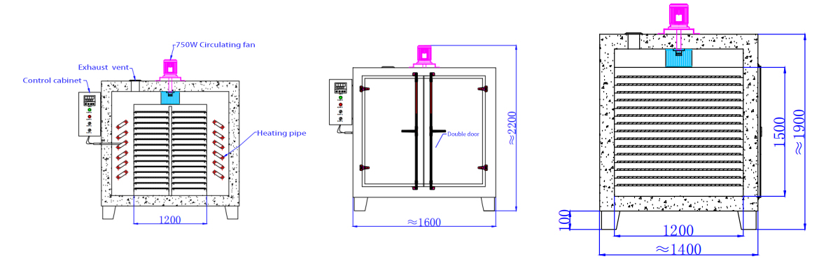 Horkovzdušná cirkulační sušárna využívá elektřinu jako zdroj tepla, je vytápěna topným tělesem, v peci cirkuluje velké množství horkého vzduchu, a to neustálým přívodem čerstvého vzduchu z přívodu vzduchu do pece. a následně vypouštěním z výfuku, čímž se zvyšuje efekt přenosu tepla, takže vnitřní vlhkost materiálu se postupně snižuje.